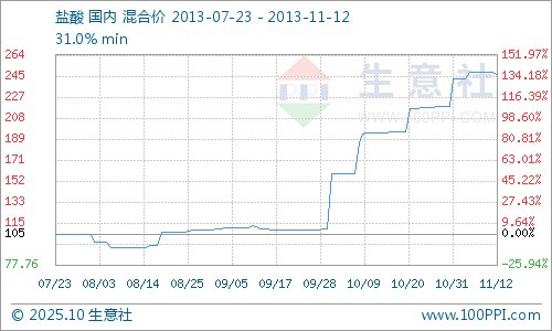 | 生意社11月20日讯 11月20日,山东海化集团盐酸价格稳定于260元/吨,出货正常。内蒙古乌海化工盐酸报价450元/吨,出货不多,库存一般,实盘可商谈。济宁金威煤电氯碱装置12日重启,目前盐酸产量较少,价格暂报160元/吨。 盐酸上游氯气近期价格小幅下挫,市场价在900-950元/吨附近,与其联产的液碱近日行情稳定,32%的液碱报价在600元/吨附近,各大氯碱厂家盐酸产量有限,主供终端用户。 据生意社盐酸价格监测,近期盐酸价格走势如下图:  11月19日液氯与盐酸商品比价指数为192.83, 较昨日下降了0.39点,较周期内最高点383.19点(2012-12-02)下降了49.68%,较2012年05月26日最低点85.71点上涨了124.98%,随着氯气价格的回落,盐酸近期或有走低的趋势。(注:周期指2012-01-01至今)   相关上市公司:英力特(000635)、鲁西化工(000830)、沈阳化工(000698)。 (文章来源:生意社,作者:韩会娟) |